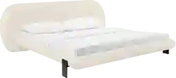 Introducing the Ballycor cream king bed, a refreshingly modern rendition of a classic mid-century silhouette that makes a bold statement in any bedroom. Supported by unique straddling solid wood legs, the curvaceous and rounded frame is upholstered in a soft faux wool blend, providing the visual texture of wool without the scratchy fibers. The oversized, thick, and rounded headboard features super trendy oversized piping, and for an added touch of style, it comes with two matching bolster pillows, creating a chic and inviting focal point for your sleep sanctuary. Customer assembly is required.