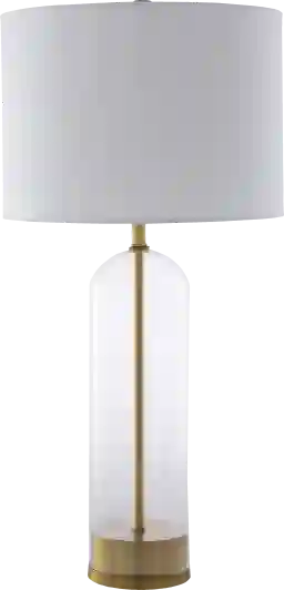 The Balsam Point offers an enduring presentation of the modern form that will competently revitalize your lovely home accenting glass with brass accents. This lamp is expertly crafted and hand finished to perfection ensuring quality, helping to make this lamp a mainstay in your home with a white cotton drum shade. Partial assembly may be required.