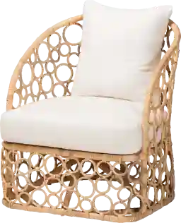 Exotic exuberance arrives in the stunning design of the Banat light brown accent chair. This bohemian piece consists of handcrafted rattan meticulously arranged by skilled artisans. The sloping armrests offer convenient comfort, while the enchanting bubble design of the frame creates a captivating display in any space. The Banat will arrive fully assembled and is fitted with a plush fabric upholstered seat cushion for superb relaxation. Uplifting the charm of any arrangement, the Banat embodies rustic elegance. Rattan is a product of nature and may have variations in areas such as, but not limited to, color, pattern, grain and texture. The hair-like strands of rattan/rattan-fiber are common due to the nature of the material.