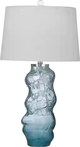 The sculptural base is crafted from art glass with a fluid, water-like texture that mimics the natural movement of the sea. Combined with the clear blue finish, this lamp is an ideal choice for coastal-inspired interiors or contemporary spaces looking for a serene, organic accent. Because each base features hand-crafted details, the unique variations in the glass ensure your lighting is a one-of-a-kind piece of functional art.