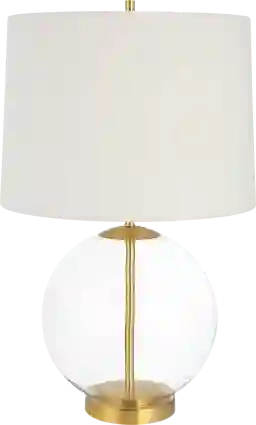 The all glass, spherical bodied Banyan Place lamp will be perfect in almost any setting. The clear body is complemented with gold accents and is finished with a slightly tapered white linen shade. Partial assembly may be required.