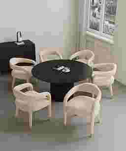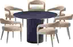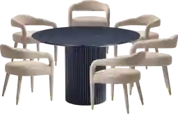 Elevate your dining experience with the Barbette black and gold 7 Pc dining table set, a fusion of rugged aesthetics and refined functionality. Crafted for convivial gatherings, its expansive surface accommodates up to eight chairs with ease, while the raw, textured allure of the wood grain adds a touch of urban sophistication. This table beckons as a centerpiece for communal moments, where the fusion of industrial design and timeless elegance sets the stage for unforgettable meals and shared stories. Customer assembly is required.