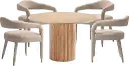 Elevate your dining experience with the Barbette natural and gold 5 Pc dining set, a fusion of rugged aesthetics and refined functionality. Crafted for convivial gatherings, its expansive surface accommodates up to 4 chairs with ease, while the raw, textured allure of the wood grain adds a touch of urban sophistication. This table beckons as a centerpiece for communal moments, where the fusion of industrial design and timeless elegance sets the stage for unforgettable meals and shared stories. Customer assembly is required.
