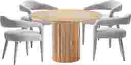 Elevate your dining experience with the Barbette natural and silver 5 Pc dining set, a fusion of rugged aesthetics and refined functionality. Crafted for convivial gatherings, its expansive surface accommodates up to 4 chairs with ease, while the raw, textured allure of the wood grain adds a touch of urban sophistication. This table beckons as a centerpiece for communal moments, where the fusion of industrial design and timeless elegance sets the stage for unforgettable meals and shared stories. Customer assembly is required.