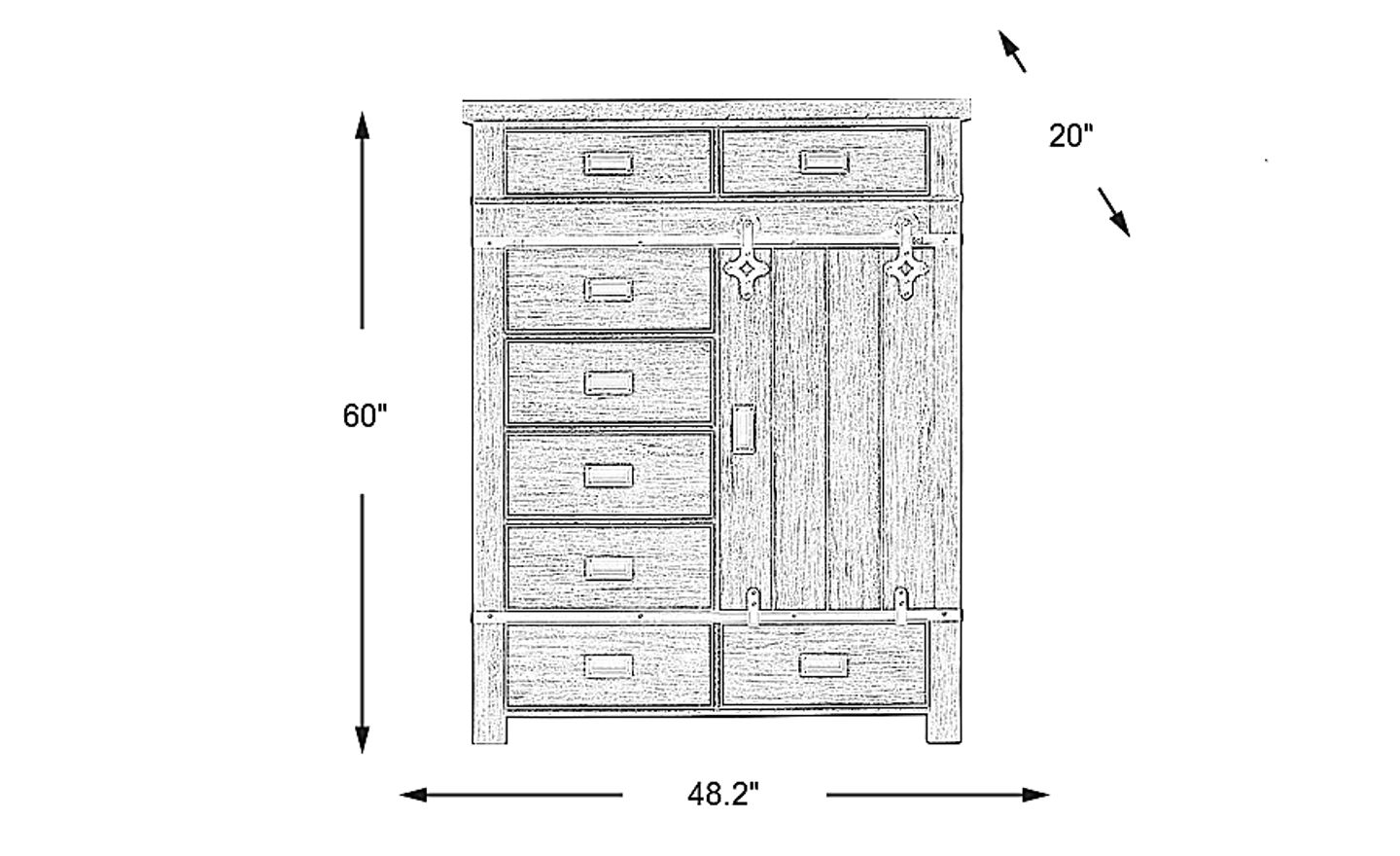 A perfect bedroom accent piece, the Barinas chest couples storage and style. With seven drawers and three concealed shelves tucked behind the sliding drawer, stowing is never an issue. Rustic in design, this piece is accentuated with metal detailing that adds an industrial-inspired touch. Soft-close drawer glides prevent unwanted slamming. This chest can hold up to a 48-inch TV.