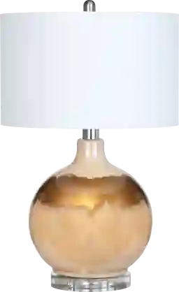 The Barker Land lamp exudes warmth and luxury. The glass orb features a reverse-painted blush finish with an abstract gold band creating an artful, expressive vibe that emits a golden glow. Partial assembly may be required.