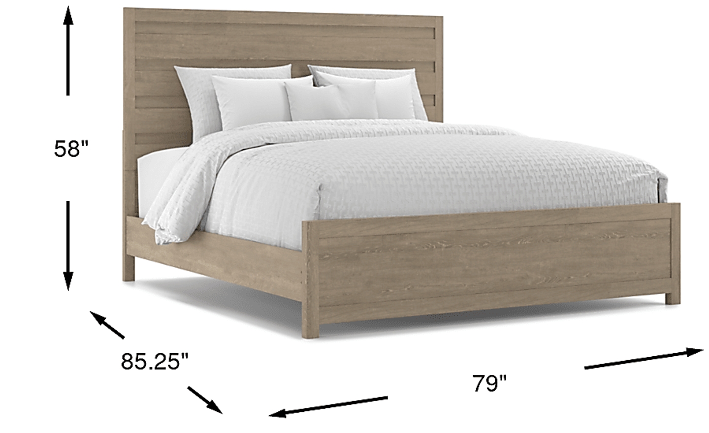 This king bed measures 85.25" L x 79" W x 58" H. When planning your room layout, our spatial experts recommend leaving at least 24 to 30 inches of walking space around the sides and foot of the bed. Given its king-sized footprint, this piece is best suited for master suites that are at least 12' x 12' to ensure the room remains functional and doesn't feel overcrowded.