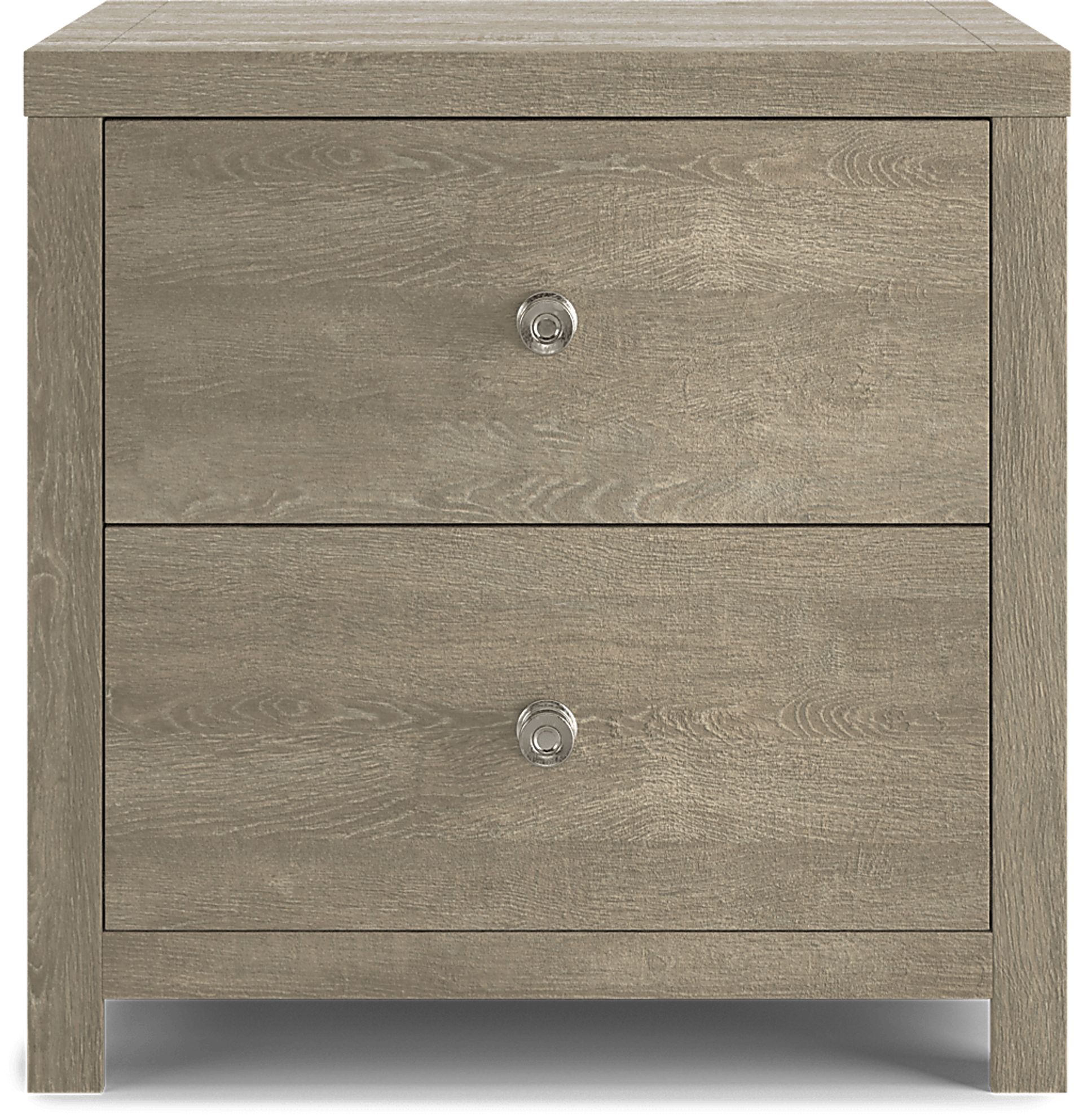 The Barringer Place nightstand keeps all of your favorite accessories nearby. Two drawers feature French and English dovetail drawer construction for stability, and dust proofing along the bottom drawer to keep items dust free. Crafted with wood solids, a gray finish is applied over oak veneers, highlighting the unique wood grain. Chrome hardware lends a contemporary touch.