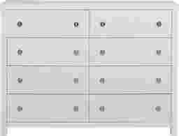 Straight lines and chrome hardware give the Barringer Place dresser a clean, modern look. Crafted with wood solids, a white finish is applied over oak veneers, highlighting the unique wood grain. Eight drawers feature French and English dovetail drawer joints and kenlin glides for stability, while the bottom drawers have been dust-proofed.