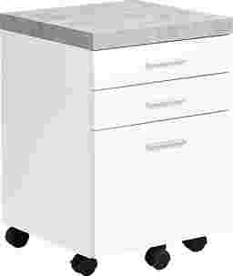 Put the extra in extraordinary with this 3 drawer Barsana filing cabinet on 5 castors! Add this multi-functional filing cabinet, finished in white with a grey cement-look top, to any desk or table to create more storage in your home office. Accented with simple modern silver colored handles, the top two drawers are useful for files, papers, books while the bottom drawer can fit standard or legal sized hanging folders. Whether tucked under a desk or placed on the side for a printer, books or other decorative items, this filing cabinet can be the little extra you needed in your office space. Customer assembly is required.