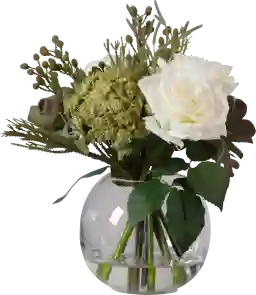 The Bartela bouquet is designed for high realism, featuring a curated mix of textures including cream roses, succulents, berries, and seed pods. The inclusion of "faux water" in the clear glass bud vase provides a convincing, fresh-cut appearance that mimics a natural floral display without the need for water changes or maintenance.