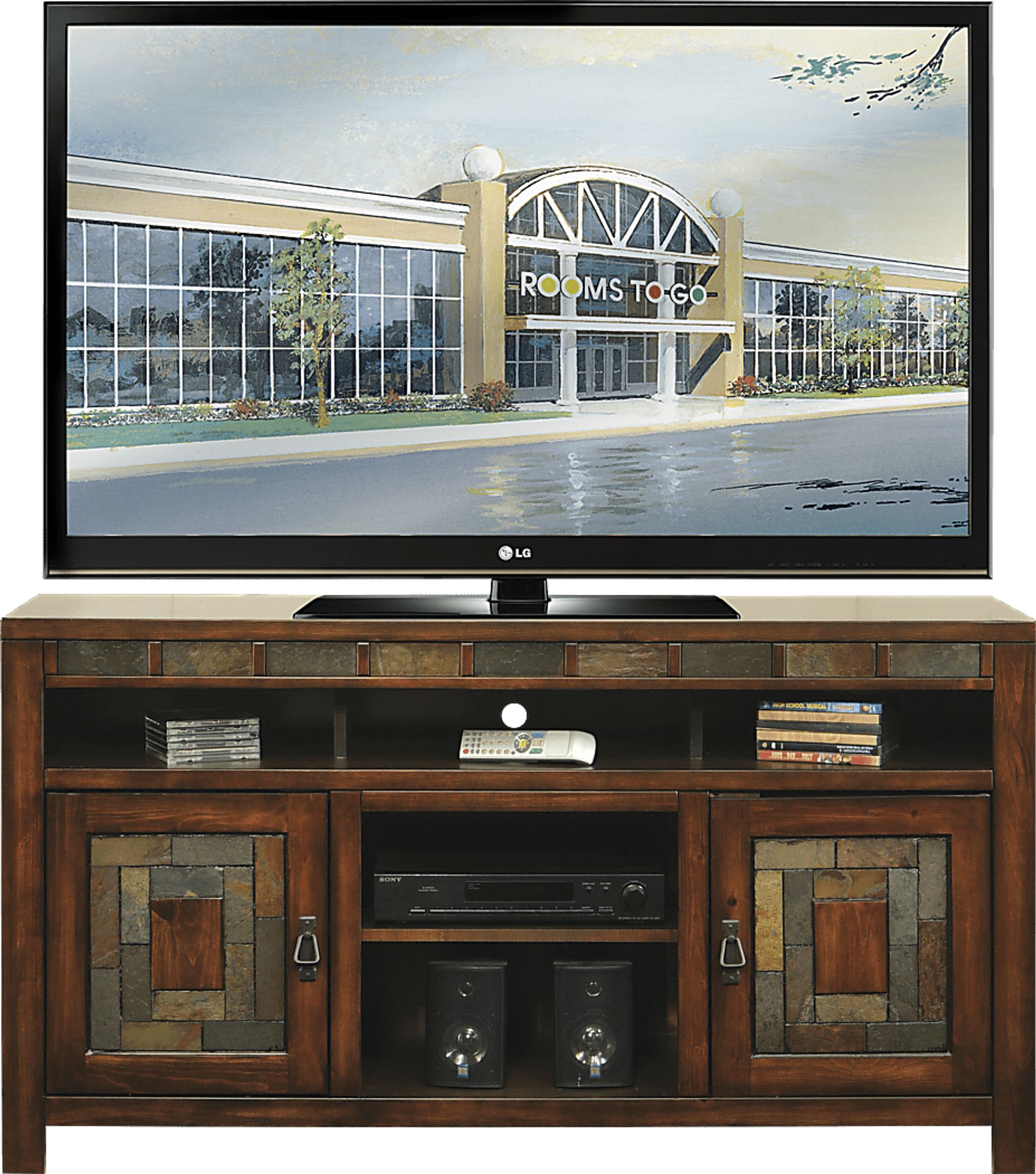 Rustic with a contemporary edge, the Bartlett flat screen TV console offers a versatile, laid back style that will elevate your entertaining space. Crafted of maple solids and veneers rendered in a rustic cherry finish, this chic console features slate accents and antique pewter finished hardware. Accommodating most 60 inch flat screen TVs, two cabinets containing an adjustable shelf each and several open compartments with rear wiring pass through holes ensure that every media component and accessory has its own designated storage spot.