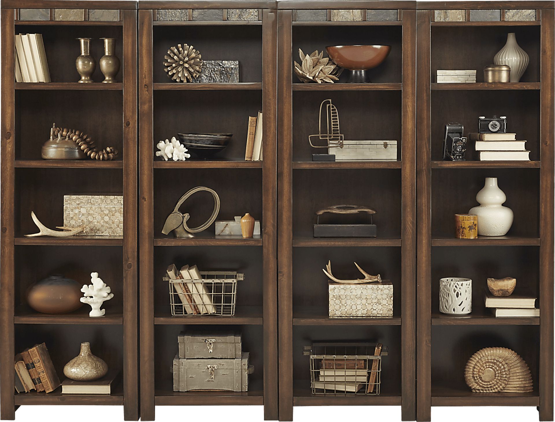 The Bartlett II bookcases provide an ideal spot to organize and display your household items. Crafted of pine solids and maple veneers in a rich brown cherry hue, each unit boasts five adjustable shelves to accommodate photos, knickknacks and decor, while a charming slate inlay at the top offers unique appeal.