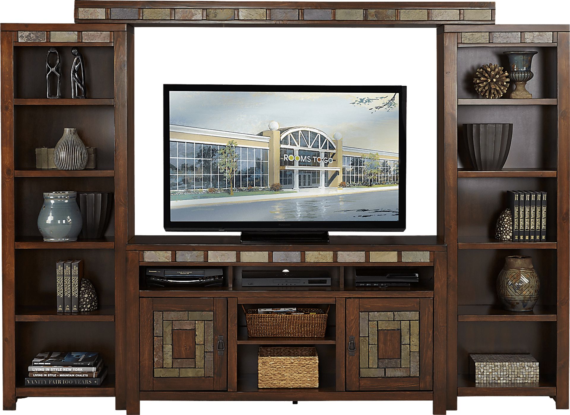 Rustic with a contemporary edge, the Bartlett flat screen wall unit offers a versatile, laid back style that will elevate your entertaining space. Crafted of maple solids and veneers rendered in a rustic cherry finish, this chic wall unit features slate accents and antique pewter finished hardware. Accommodating most 60 inch flat screen TVs, the center console features two cabinets containing an adjustable shelf each and several open compartments with rear wiring pass through holes. Two side piers flanking the console feature five fixed shelves, offering plenty of room for putting dcor, knick knacks and photos on display. A bridge linking the two side piers features additional slate accents for a sturdy, cohesive look.