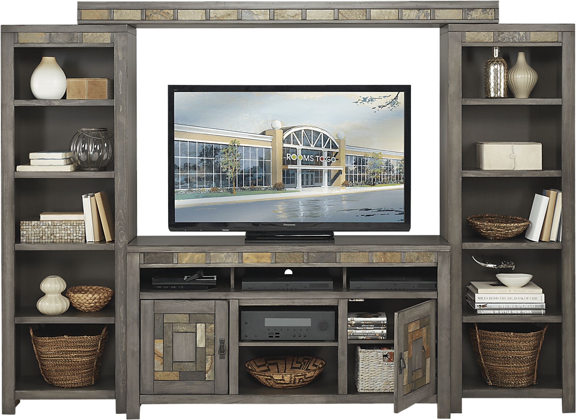 Rustic with a contemporary edge, the Bartlett flat screen wall unit offers a versatile, laid back style that will elevate your entertaining space. Crafted of maple solids and veneers rendered in a rustic gray finish, this chic wall unit features slate accents and antique pewter finished hardware. Accommodating most 60 inch flat screen TVs, the center console features two cabinets containing an adjustable shelf each and several open compartments with rear wiring pass through holes. Two side piers flanking the console feature five fixed shelves, offering plenty of room for putting decor, knick knacks and photos on display. A bridge linking the two side piers features additional slate accents for a sturdy, cohesive look.