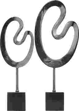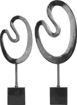 Embrace artistic expression with a style that highlights bold designs with sleek lines, neutral elements, and a minimalist aesthetic with the Baspo Sculpture, Set of 2. These lavish black abstract sculptures are crafted of high quality aluminum and marble. The metal art sculptures feature a textured metallic black aluminum finish and a black marble finish. These art deco sculptures feature abstract formed oval rings with a lower metal rod stand and a classic marble cube platform. Each sculpture measures 9.90L x 4.10W x 24.25H, 7.65L x 4.25W x 20.65H inches, and collectively weighs 11.11 lbs. Customer assembly is required.