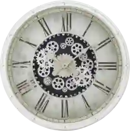 Stay right on trend with the Bavariay white wall clock, featuring an exposed gear mechanism design. This large, oversized wall clock in a transitional style is crafted with a durable plastic frame and a clear glass surface over the easy to read, printed roman numeric markings. The quartz movement on this analog ensures accurate timekeeping, while the moving white metal gears adds a unique vintage touch to this non-ticking clock. No assembly is required, simply insert 3 AA batteries, not included, hang it up and let this clock become the focal point in your decor. Transform that empty wall space with this elegant oversize clock if you are looking to add a stylish and functional piece to your home decor.