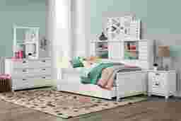 The Bay Street bookcase daybed's classic design will grow with your child throughout the years, or even look great in a guest room. Crafted with birch solids and birch veneers in a white finish, double bookshelves feature sliding doors which conceal shelves where favorite books, trophies, or other trinkets can be organized or displayed. Add a trundle option, sold separately, for more storage. Mattress and foundation (if required) sold separately.