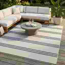With the subtle allure of a sailboat cutting its way across crystal clear waters, the Bay Stripe rug's simple design and effortless palette draw spaces together with a light touch. This easy-living and easy-to-love accent features nautical stripes in navy blue against an off-white background for a coastal vibe that can stay fresh with just a simple rinse from a garden hose. 100% Polypropylene.