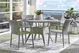 Get outside in style with the Bay Terrace dining set. This relaxed, casual collection is crafted with gray woven wicker and an all-weather welded aluminum frame for rust resistance. The inviting 48 inch round table and arm chairs blend style and durability to create an outdoor dining area perfect for meals, refreshments and cocktails.