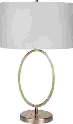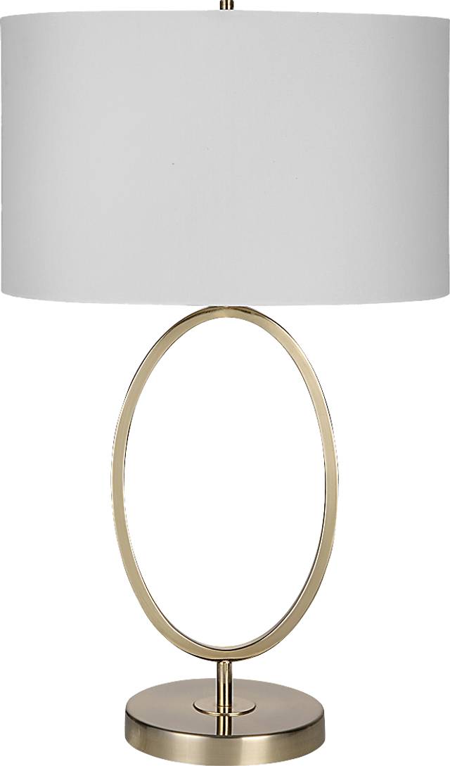 Add a mid-century modern look to your space with the Bayvard Sea lamp. An oval center ring gives a feeling of openness to this unique table lamp. The metal base features a golden brass finish. It is paired with an oval hardback white linen shade. Partial assembly may be required.