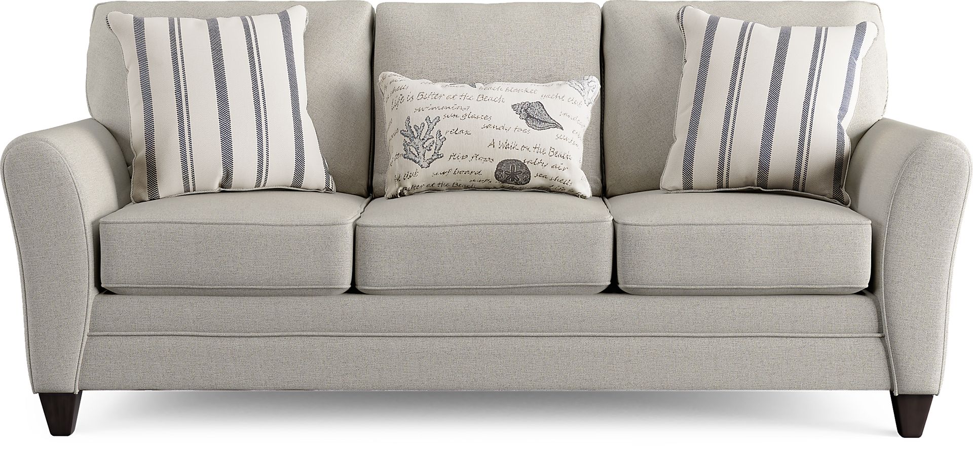 Create a coastal vibe with the Beachfront sofa. From the silver color to the fun mix of striped and beach themed pillows, this sofa takes a casual approach to home decor. Soft woven upholstery and reversible back and seat cushions ensure that the sofa is as comfortable as it is stylish. Tailored touches include welted seams on the arms and cushions. Tucked away and easily pulled out for overnight guests, the sleeper boasts the exceptional comfort of a Sealy Royale queen size mattress. Warm brown finished tapered legs provide support. Upholstery: 100% Polypropylene.