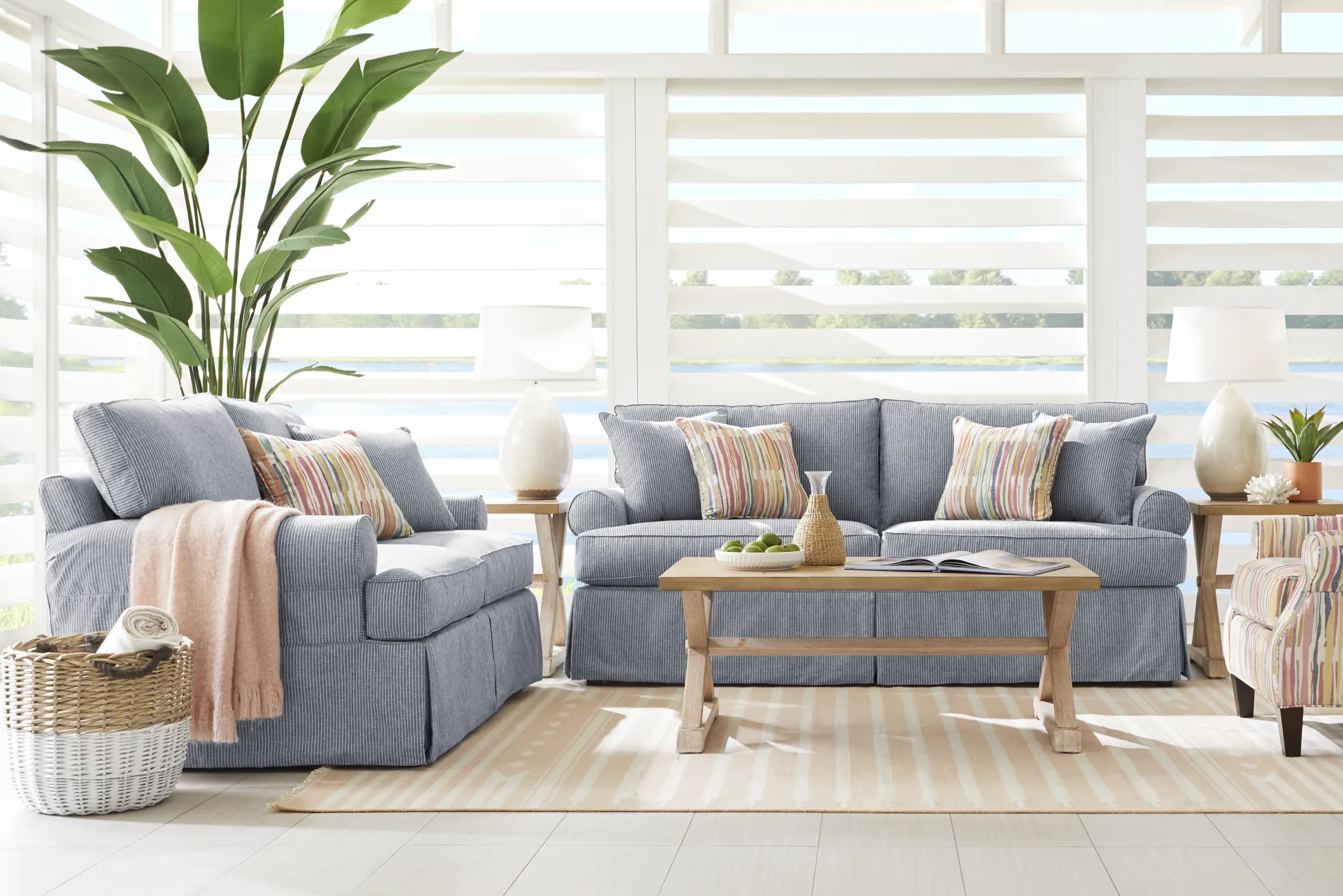 Bring the relaxed style of coastal living into your home with the Beachside denim slipcover collection. Actual slipcovers in blue denim are washed - just like your favorite pair of jeans for easy care and durability. Contemporary accent pillows add just the right touch. Hardwood frames are reinforced for stability and strength, making this an ideal group for a busy family room or den. When it's time for overnight guests, the queen size Nature's Bed mattress, with gel foam comfort, offers an easy solution. Upholstery: 100% Cotton. Cleaning Instructions: Use water based cleaning agents or foam. Tables not as shown in room image.