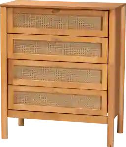 Bring an ambiance of robust serenity to your bedside with the lovely Beargrass brown chest. This piece is crafted from sturdy wood. Four drawers provide ample storage space for clothes and linens while reserving the tabletop as a fantastic display area. The Beargrass features woven distressed-finished rattan drawer fronts for an added touch of classic elegance. Rounded legs lend a smooth silhouette, making the Beargrass a gorgeous bedroom fixture. Customer assembly is required.