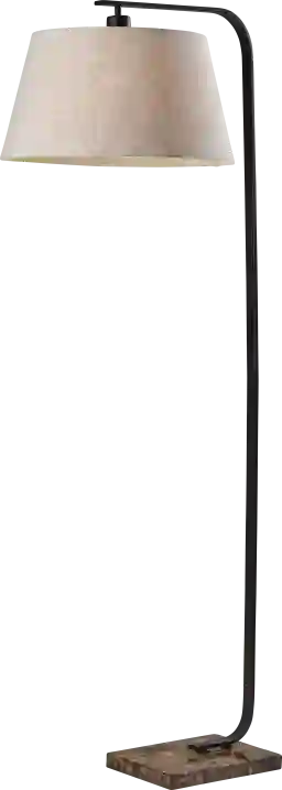 With a simple, straight forward design, the Beau Isle floor lamp features a brown marble base accompanied by a black metal gooseneck frame and a neutral tone, textured shade. The three-way rotary switch can control a bulb up to 100 watts.