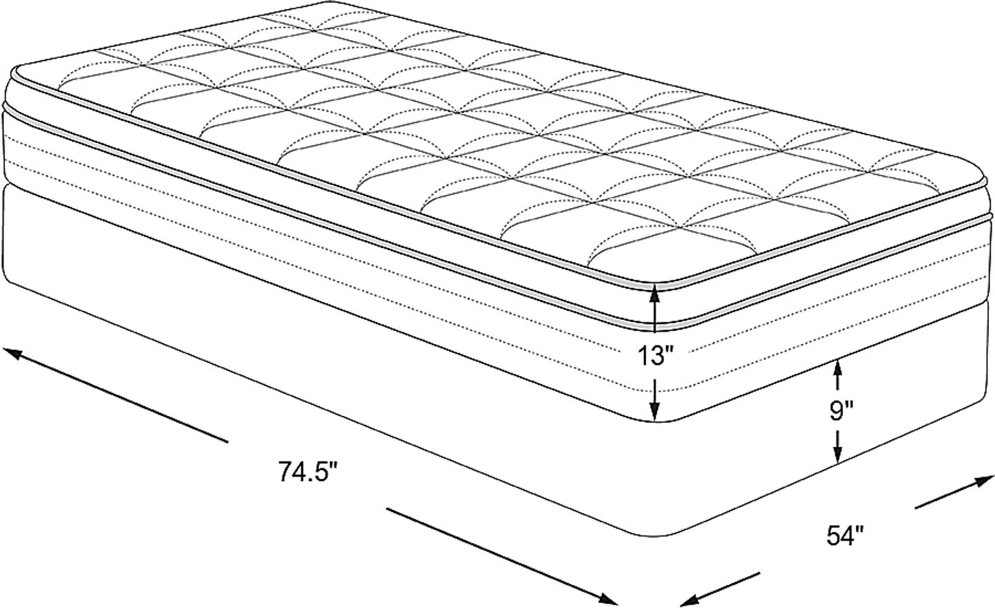 mattress: 74.5"l x 54"w x 13"h, foundation: 9"h