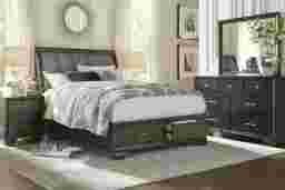 Boasting a versatile design, the Beckwood bed offers transitional style with space-saving storage. Crafted of wood solids and Mindy veneers, this sleigh bed reveals beautiful wood grain detailing throughout. Its dark gray finish allows it to blend in seamlessly with any room. Upholstered in gray fabric, the headboard features vertical channeling for an added dose of elegance. Two drawers built into the footboard are adorned with bar hardware in a sleek brushed nickel finish. Mattress and foundation (if required) sold separately. Bed shown is queen size.