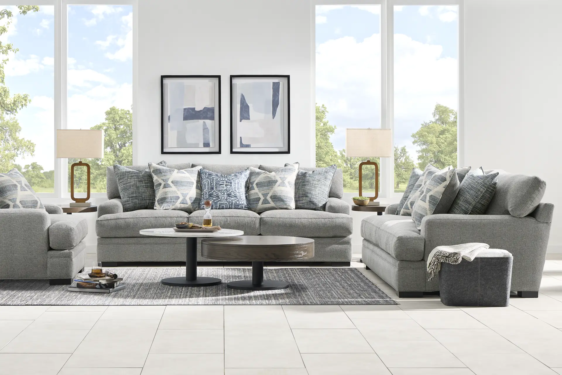 Hosting a versatile transitional design, the Bedford Park collection from Cindy Crawford Home delivers elevated style and astounding comfort. Upholstered in gray chenille, each piece has a soft, textured quality that will make family and friends feel right at home. Offering a hint of modern style, its low-profile track arms bring a chic aspect to the look. Seat cushions feature a plush custom blend of feathers, fiber and down surrounding a supportive foam core for comfort that's soft yet structured. In addition, seat and back cushions are reversible to help extend the life of your living room. An assortment of accent pillows features beautiful patterns in varying shades of blue. Block legs with a black finish add an elegant final touch. Upholstery: 100% polyester. Cleaning Instructions: Use water-based cleaning agents or foam.