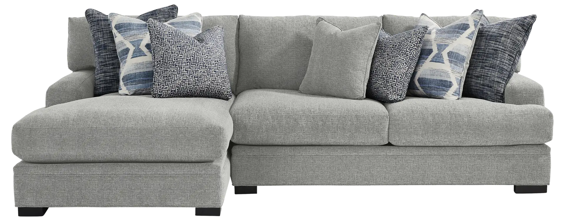 Boasting noteworthy style with comfort to match, the Bedford Park sectional from Cindy Crawford Home creates a cozy gathering area for all to enjoy. Upholstered in gray chenille, this chaise sectional has a soft, textured quality that will make family and friends feel right at home. Seat cushions feature a plush custom blend of feathers, fiber and down surrounding a supportive foam core for comfort that's soft yet structured. Offering a hint of modern style, its low-profile track arms bring a chic aspect to the look. In addition, seat and back cushions are reversible to help extend the life of your sectional. An assortment of accent pillows features beautiful patterns in varying shades of blue. Block legs with a black finish add an elegant final touch. RAF loveseat, LAF chaise. Upholstery: 100% polyester.
