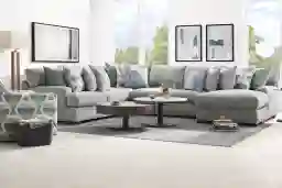 This Cindy Crawford Home sectional is specifically designed to create a "cozy gathering area" for large groups. The deep chaise and wide loveseat configuration maximize seating capacity without making the room feel closed off. The addition of designer accent pillows in varied blue patterns provides a curated, finished look that balances the neutral gray tones, making it an ideal centerpiece for a sophisticated yet comfortable home entertaining space.