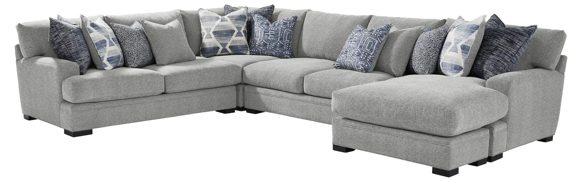Boasting noteworthy style with comfort to match, the Bedford Park sectional from Cindy Crawford Home creates a cozy gathering area for all to enjoy. Upholstered in gray chenille, this chaise sectional has a soft, textured quality that will make family and friends feel right at home. Seat cushions feature a plush custom blend of feathers, fiber and down surrounding a supportive foam core for comfort that's soft yet structured. Offering a hint of modern style, its low-profile track arms bring a chic aspect to the look. In addition, seat and back cushions are reversible to help extend the life of your sectional. An assortment of accent pillows features beautiful patterns in varying shades of blue. Block legs with a black finish add an elegant final touch. LAF sofa chaise, corner wedge, RAF loveseat. Upholstery: 100% polyester.