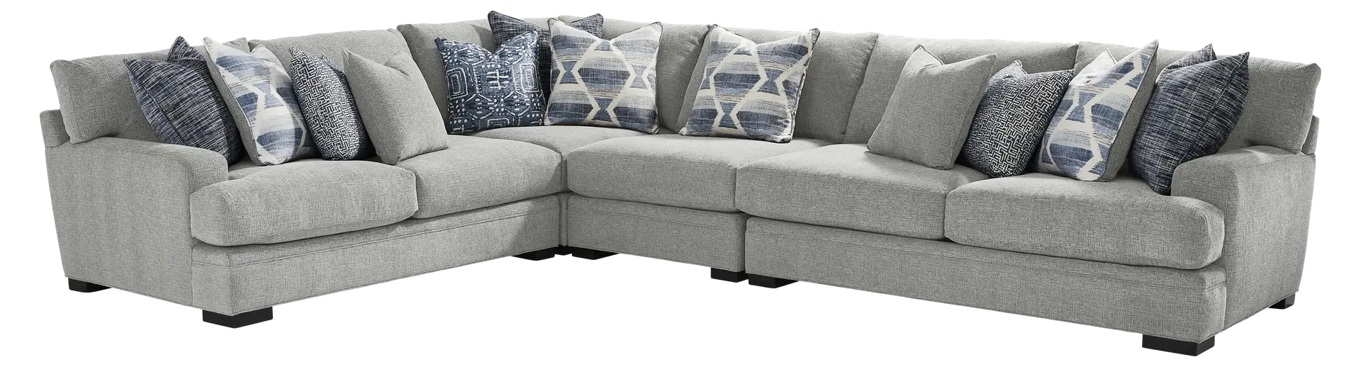 Boasting noteworthy style with comfort to match, the Bedford Park sectional from Cindy Crawford Home creates a cozy gathering area for all to enjoy. Upholstered in gray chenille, this chaise sectional has a soft, textured quality that will make family and friends feel right at home. Seat cushions feature a plush custom blend of feathers, fiber and down surrounding a supportive foam core for comfort that's soft yet structured. Offering a hint of modern style, its low-profile track arms bring a chic aspect to the look. In addition, seat and back cushions are reversible to help extend the life of your sectional. An assortment of accent pillows features beautiful patterns in varying shades of blue. Block legs with a black finish add an elegant final touch. RAF sofa chaise, corner wedge, LAF loveseat. Upholstery: 100% polyester.