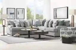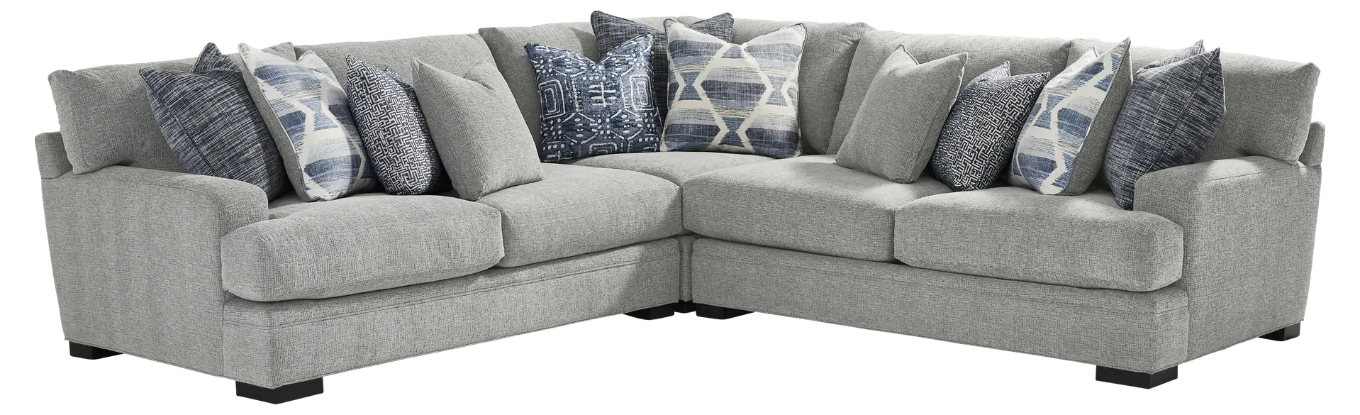 Boasting noteworthy style with comfort to match, the Bedford Park sectional from Cindy Crawford Home creates a cozy gathering area for all to enjoy. Upholstered in gray chenille, this sectional has a soft, textured quality that will make family and friends feel right at home. Seat cushions feature a plush custom blend of feathers, fiber and down surrounding a supportive foam core for comfort that's soft yet structured. Offering a hint of modern style, its low-profile track arms bring a chic aspect to the look. In addition, seat and back cushions are reversible to help extend the life of your sectional. An assortment of accent pillows features beautiful patterns in varying shades of blue. Block legs with a black finish add an elegant final touch. LAF loveseat, corner wedge, RAF loveseat. Upholstery: 100% polyester.
