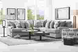 Boasting noteworthy style with comfort to match, the Bedford Park sectional from Cindy Crawford Home creates a cozy gathering area for all to enjoy. Upholstered in gray chenille, this sectional has a soft, textured quality that will make family and friends feel right at home. Seat cushions feature a plush custom blend of feathers, fiber and down surrounding a supportive foam core for comfort that’s soft yet structured. Offering a hint of modern style, its low-profile track arms bring a chic aspect to the look. In addition, seat and back cushions are reversible to help extend the life of your sectional. An assortment of accent pillows features beautiful patterns in varying shades of blue. Block legs with a black finish add an elegant final touch. LAF loveseat, corner wedge, RAF loveseat. Upholstery: 100% polyester.