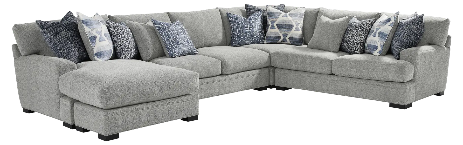 Boasting noteworthy style with comfort to match, the Bedford Park sectional from Cindy Crawford Home creates a cozy gathering area for all to enjoy. Upholstered in gray chenille, this expansive sectional has a soft, textured quality that will make family and friends feel right at home. Seat cushions feature a plush custom blend of feathers, fiber and down surrounding a supportive foam core for comfort that's soft yet structured. Offering a hint of modern style, its low-profile track arms bring a chic aspect to the look. In addition, seat and back cushions are reversible to help extend the life of your sectional. An assortment of accent pillows features beautiful patterns in varying shades of blue. Block legs with a black finish add an elegant final touch. LAF loveseat, RAF loveseat, corner wedge, armless chair. Upholstery: 100% polyester.