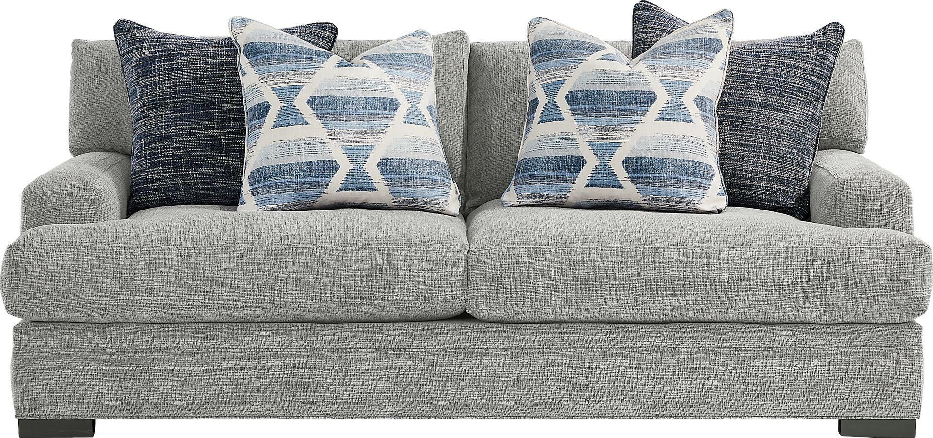 Perfect for smaller spaces, the Bedford Park apartment sofa from Cindy Crawford Home delivers both style and plush comfort. Upholstered in gray chenille, this piece has a soft, textured quality that will make family and friends feel right at home. Offering a hint of modern style, its low-profile track arms bring a chic aspect to the look. Seat cushions feature a plush custom blend of feathers, fiber and down surrounding a supportive foam core for comfort that’s soft yet structured. In addition, seat and back cushions are reversible to help extend the life of your apartment sofa. Included accent pillows display complementary patterns in varying shades of blue. Block legs with a black finish add an elegant final touch. Upholstery: 100% polyester.