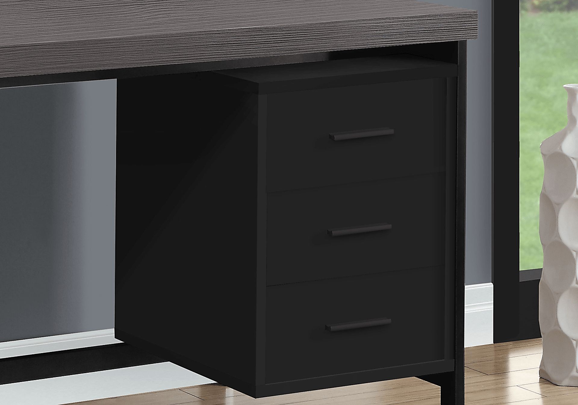 Create a modern industrial style in your home with this contemporary designed Bedlington desk with 3 convenient storage drawers in a bold black and grey wood grain-look finish. A rich black metal frame supports the thick desk top, with generous storage space for all your office supplies. Finished on all sides, this desk looks chic for a home and commercial office or even as part of your living room space. Customer assembly is required. Customer assembly is required.