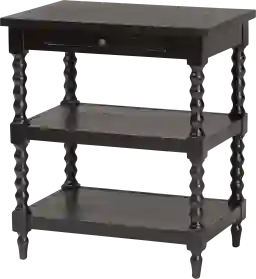 Overhaul the atmosphere of any arrangement with the elegant poise of the Beecreek black end table. This lovely piece is comprised of sturdy wood. The broad tabletop and open shelf between its legs create a stunning exhibit for household decorations while the pullout shelf fulfills the needs of daily use. The Beecreek features exquisite turned legs for excellent stability and support in captivating design. A metal knob adorns the piece with a touch of retro charm, making this table a magnificent addition to any layout. Customer assembly is required.