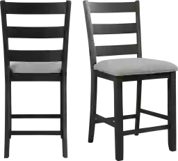 The Beedlescape counter height stools are the perfect chairs for dining or entertaining. The chairs feature a ladder back design and an upholstered seat in a gray fabric. The wire brush, black finish on the chairs is truly unique, adding instant flair to this set. Filled with high density foam for comfortable dining. The gray upholstery contrasts well with the black base and will give the updated look your dining room has been craving. Customer assembly is required.