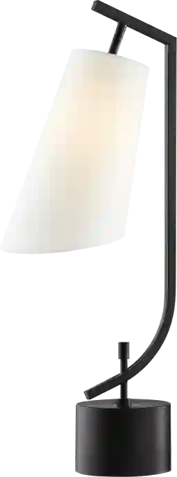 The geometric Beeler Home lamp features a crisp black and white palette. This transitional table lamp presents an edgy, fine art look. A slender black metal frame adds a sharp arc accent to work asymmetrical drama into the mix. A slim white fabric column shade delivers supreme contrast. Partial assembly may be required.