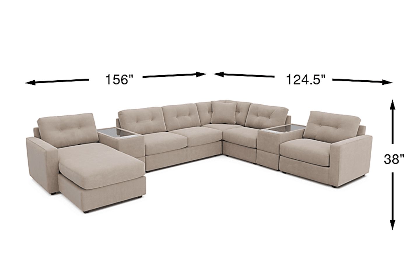 With expansive dimensions of 156"w x 124.5"d, this 7-piece set is an ideal anchor for large entertainment spaces, such as a suburban finished basement or a spacious open-concept living area. Its modular nature allows you to scale the footprint up or down, while the integrated speakers and charging ports make it a definitive choice for creating a modern home theater environment.