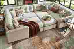 Discover the limitless possibilities of the Drew & Jonathan ModularOne, thoughtfully designed with comfort and flexibility in mind. This customizable seating solution features individual pieces that can be reconfigured to the shape you need. Game days, movie nights, sleepovers, and everyday relaxation are all better when the seating arrangement you want is always right at your fingertips.Each individual piece is upholstered on all sides in our signature fabric, New Horizon. This soft, beige chenille includes Repreve yarn, made with recycled plastic bottles. The seating area has welted track arms, top-stitched seat cushions and button-tufted back cushions for an elegant silhouette. Two ottomans on casters slide into the middle and lock in place to create a cozy area the whole family can enjoy. A matching pillow provides the perfect final touch. Includes LAF chair, two corner wedges, 2 armless chairs, 2 ottomans, & RAF chair. Visit a showroom to learn more about individual components and to work with a sales specialist to customize your own configuration today.