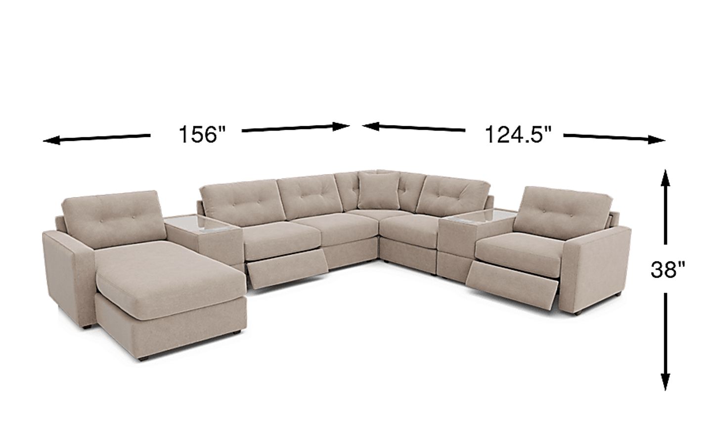 This expansive seating solution requires a significant footprint, measuring 156 inches wide by 124.5 inches deep. For optimal functionality in large family rooms or open-concept living areas, we recommend allowing at least 4-6 inches of clearance from the wall to ensure the power reclining mechanisms can fully extend. Measuring your entryways is equally vital; however, because this is a modular system delivered in eight individual pieces, it is an excellent choice for homes with narrow hallways or tight corners where a traditional one-piece sofa might not fit.