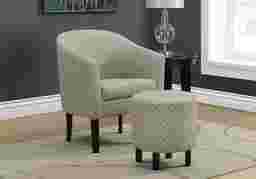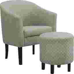 This elegant barrel shaped Belcaro accent chair and matching circular ottoman set is given a contemporary upgrade on a classic style. The understated geometric trellis pattern in light gray and beige contrasts vividly with the dark brown solid wood legs that are slightly flared at the back of the chair. With firm but comfortable cushioning on both the chair and ottoman and an easy transitional style, this two-piece set will become your favorite accent furniture whether placed in a designated reading corner in a bedroom or as part of your livingroom or family room ensemble.. Customer assembly is required. All parts are located in the compartment underneath the chair