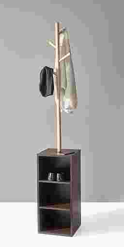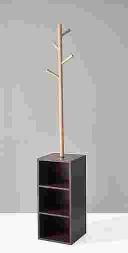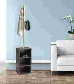 An organizational solution for a small space, or a way to tidy up the entry way in style, the Belcaolla storage coat rack provides 4 functional coat hooks as well as 3 storage cubbies. A convenient place to store shoes or accessories, this storage piece allows for easy access on the way out the door. Mixing natural and walnut wood finishes, this storage coat rack is not only super functional, but can fit into a variety of different room decors with style. Customer assembly required.