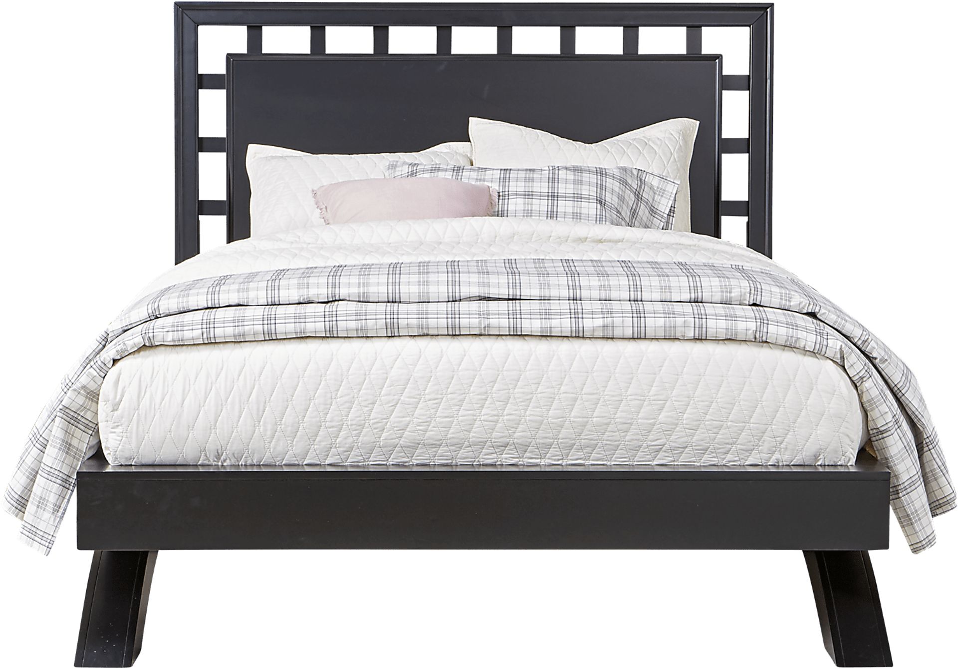The sleek Belcourt bed is perfect for those who appreciate contemporary design. Rich in visual appeal, it has a lattice style headboard and dramatic arched base for a clean, open look. Crafted with wood solids, the bed is completed with a rich black finish. This bed requires a mattress only, no boxspring is needed. Mattress and foundation (if required) sold separately. Bed shown is queen size. Bed board required for mattress support.